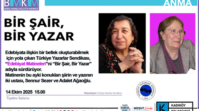 Türkiye Yazarlar Sendikası ve Kadıköy Belediyesi, “Edebiyat Matineleri” kapsamında anlamlı bir etkinliğe ev sahipliği yapacak. “Bir Yazar, Bir Şair” temasıyla düzenlenen etkinlikte, edebiyatımızın iki önemli ismi şair Sennur Sezer ve yazar Adalet Ağaoğlu anılacak.