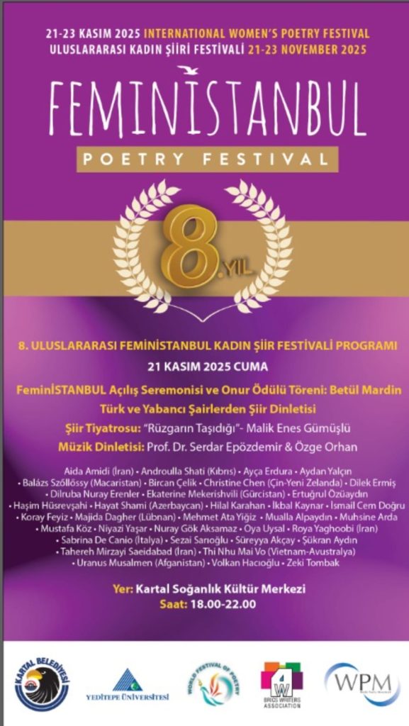 UNESCO bağlantılı şiir kuruluşları arasında yer alan FeminİSTANBUL Kadın Şiiri Festivali, 21-23 Kasım 2025 tarihlerinde 8. kez kapılarını açmaya hazırlanıyor. Kartal Belediyesi’nin destekleriyle gerçekleşecek festivalin bu yılki manifestosu, “Gazze katliamından sonra medeniyetten ve insanlıktan söz edilebilir mi?” sorusu üzerine kurulu. Organizasyon, kadınlık temalı evrensel bir diyalog ve sanat platformu olma amacını sürdürüyor.