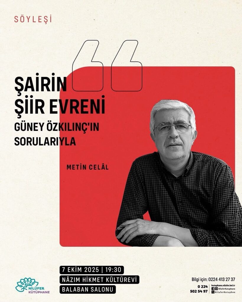 Şairin Şiir Evreni söyleşi dizisi, Ekim ayında edebiyatseverleri şair ve yazar Metin Celâl ile buluşturuyor. Bursa Nâzım Hikmet Kültürevi, Balaban Salonu, bu önemli edebiyat etkinliğine ev sahipliği yapacak. 7 Ekim tarihinde saat 19.30’da başlayacak olan söyleşi, Metin Celâl’in şiir dünyasına derinlemesine bir yolculuk vadediyor.