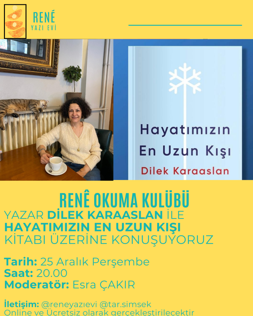 Rene Okuma Kulübü, edebiyatın derinliklerine inmeye devam ediyor. Bu ayki yediinci oturumu, tanınmış yazar Dilek Karaaslan’ın etkileyici romanı “Hayatımızın En Uzun Kışı” etrafında şekillenecek. Toplanma tarihi 25 Aralık olarak belirlenirken, etkinlik saat 20:00’de başlayacak.